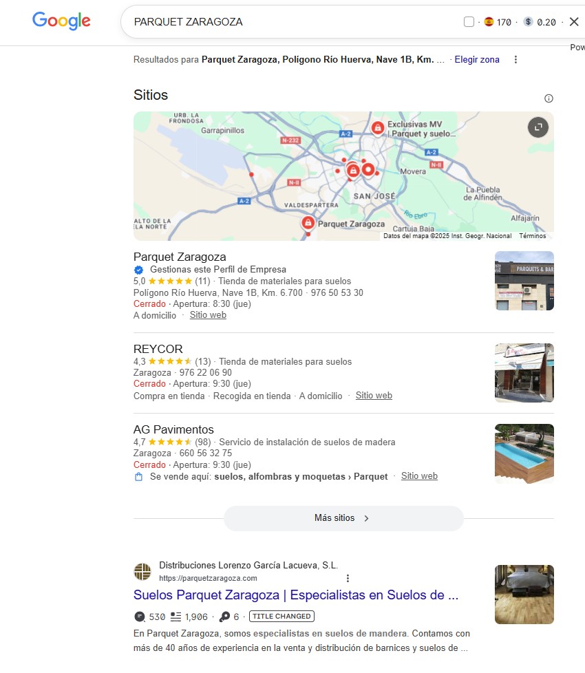 En pocos meses, Parquet Zaragoza pasó de no aparecer en los resultados de Google a situarse entre las primeras posiciones para sus principales palabras clave locales, incluyendo: